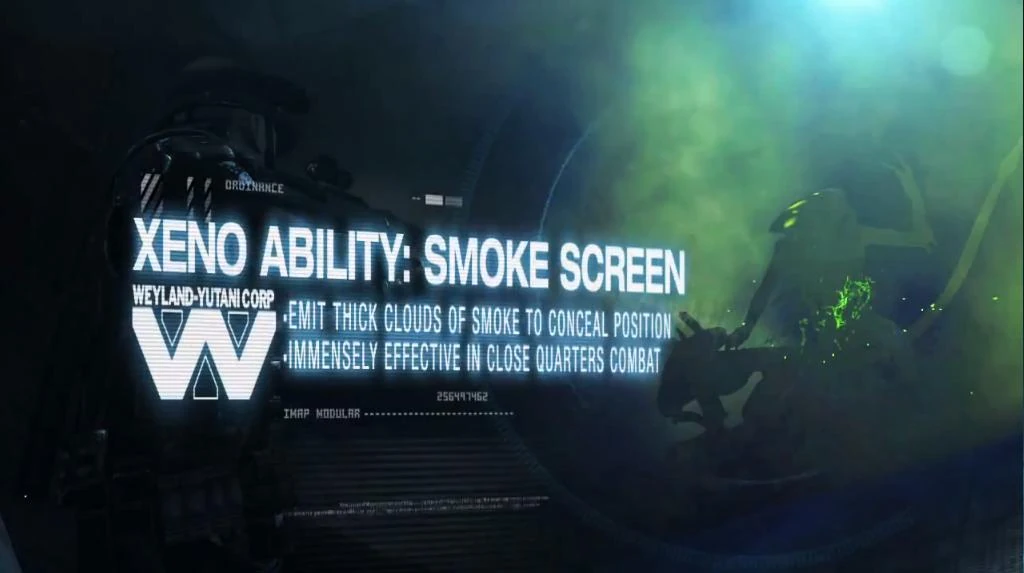 dispatch a victim. In Aliens: Colonial Marines, Aliens have attributes unique to a certain group, some are able to jump great distances and heights and some have increased durability and strength. New capabilities for Aliens unique to the game are a smoke screen, cloak, hyper metabolism and heightened senses. ![]()