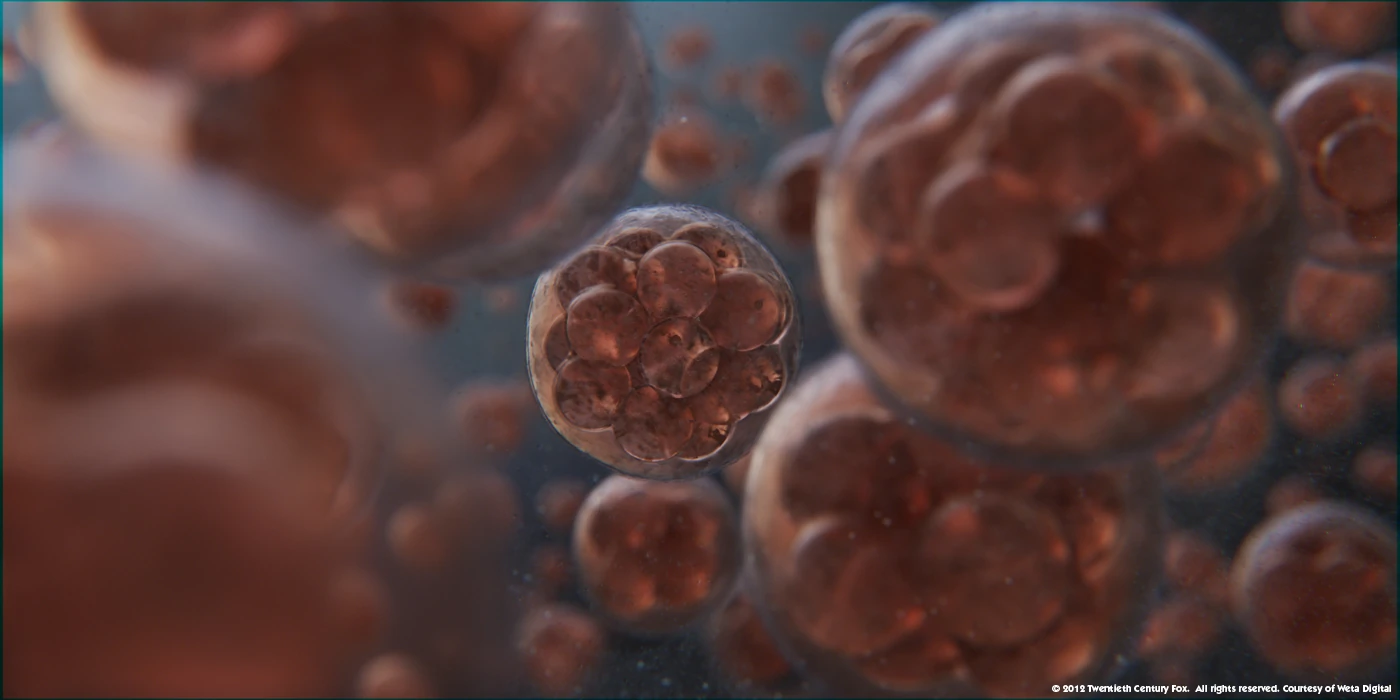 Weta CG supervisor Phillip Leonhardt generated sub surface scattering with 3D modelers creating the understructure of the vascular system which lead compositor Christophe Salzmann integrated with practical effects of the bruising effects using silicon, ink and oil. Using melting polystyrene for the decaying DNA blended with shader and model work and cloudy black particles for the decomposition of the engineer as he finally decayed along with the melt water. Underwater DNA strands can be seen reforming using particle and shader effects, depicting life reforming again.