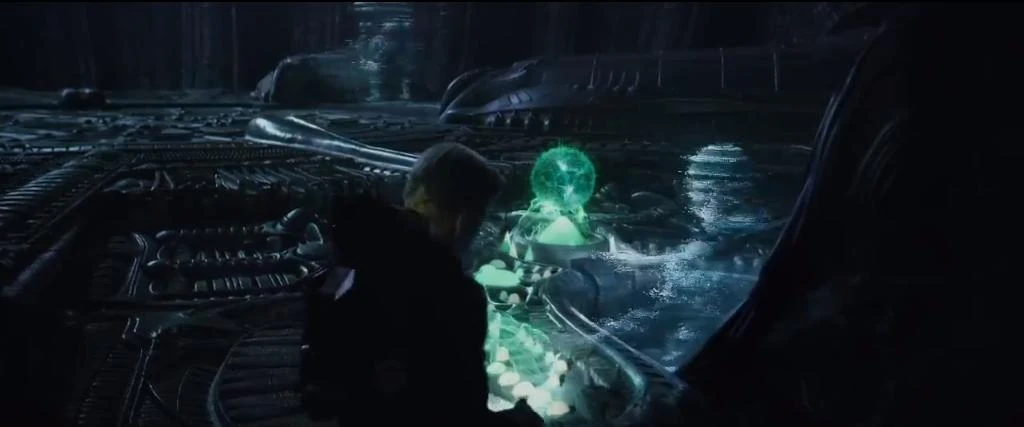 After examining the contents he infects Holloway with a drop of the liquid that it contained. David also examines the Terraformer's Biomask in Med Bay with help from Ford and Shaw while Holloway and Vickers are there. Later talking to Weyland in stasis before he emerges, and questioned by Vickers shortly afterwards who with David are the only two aware of Weyland being aboard ship.