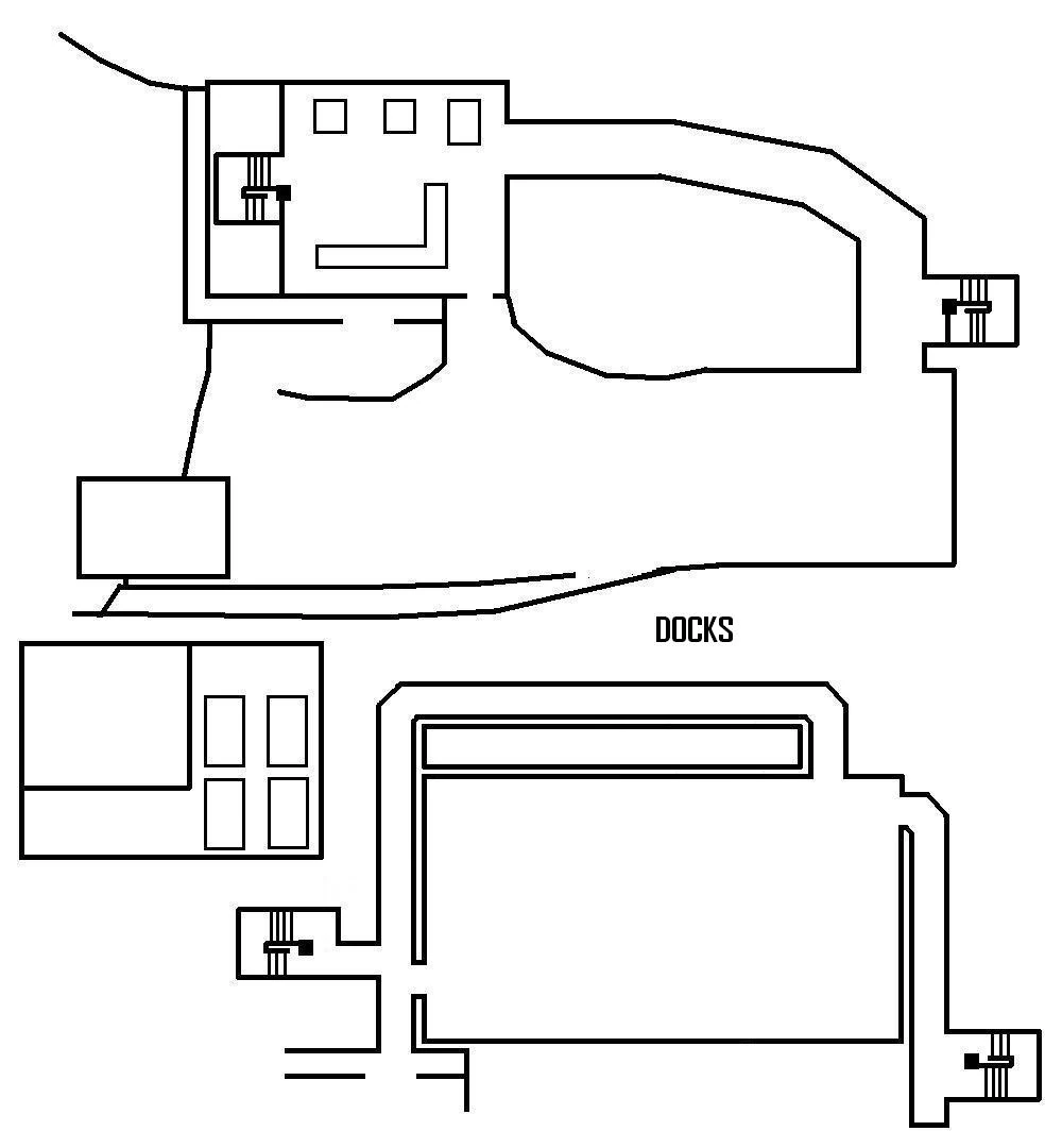 ConfigurationDocks, stairs interconnect the levels in the underground complex which leads to an out door area with water to one side. |