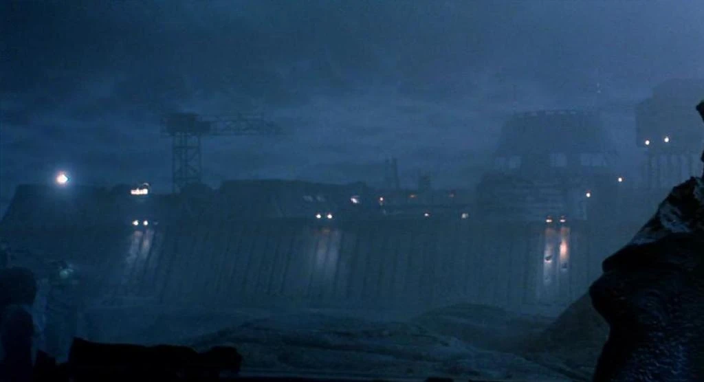 Model miniatures were filmed on two full sound stages 5-8' high by 40' long, rubbish and ash was used to dress the set and a matte backdrop for the atmosphere appeared behind the processing station.
