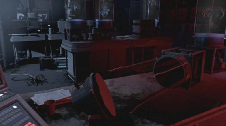 Command, laboratories and research were also mainly made from wood frames and plastic floor and wall tiles. These then dressed to appear as if metal, glass or plastic finish and also as if constructed on site from prefab units. Lights, terminals and switches were used in Command with pre designed complex and Atmosphere Processor building plans placed on 2D display panels which were back lit, plans would be varied in cut scenes. The use of vending machine parts and old tape spool units gave the impression of a mainframe, wallpaper would be used for walls and ceilings were plastic panels wouldn't be that necessary.