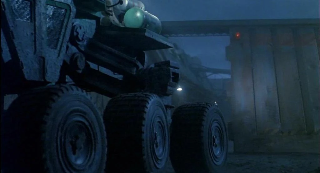 In filming with the crew the full size APC was used, at the entrance as the squad first enter the installation, as Ripley takes the APC collecting the surviving crew, here filming the Alien and the crew entering, as they run down the Aliens, production crew used silicon models which could be positioned in set ways that no cables or controls would be necessary these could then be exploded for effect. Other Atmosphere Processor building filming occurred at a power station in London.