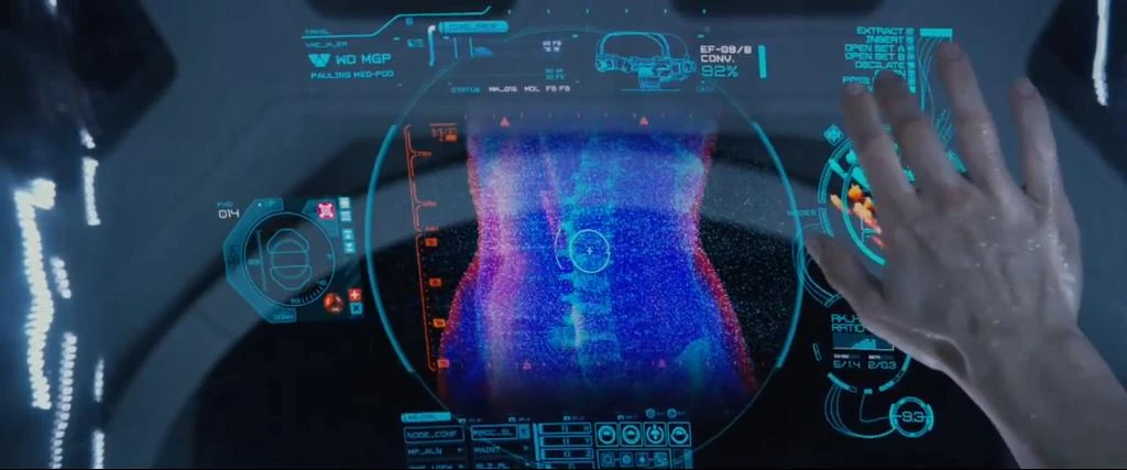 James McKeown senior prop maker on Prometheus at Pinewood Studios worked on all aspects of the medical bay's MedPod (720i) and RT01 ATV's seating and interior. Interfaces (UIs) in filming as Shaw was programming operations were projected in real time and made by Territory Studios and Inventing Interactive this also included the in pod's internal displays. The VFX of the automated surgery in the MedPod was produced by Weta Digital who created the CGI robotic arms which were filmed with both prosthetic and CGI body parts, this included the final surgical procedure with an automated prop of the small Trilobite.
