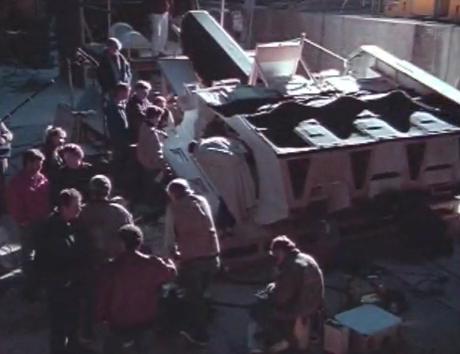 For the salvage of the EEV production crew used the 3' model held by a crane filmed against a blue screen, miniature people were positioned on it giving it a sense of scale.